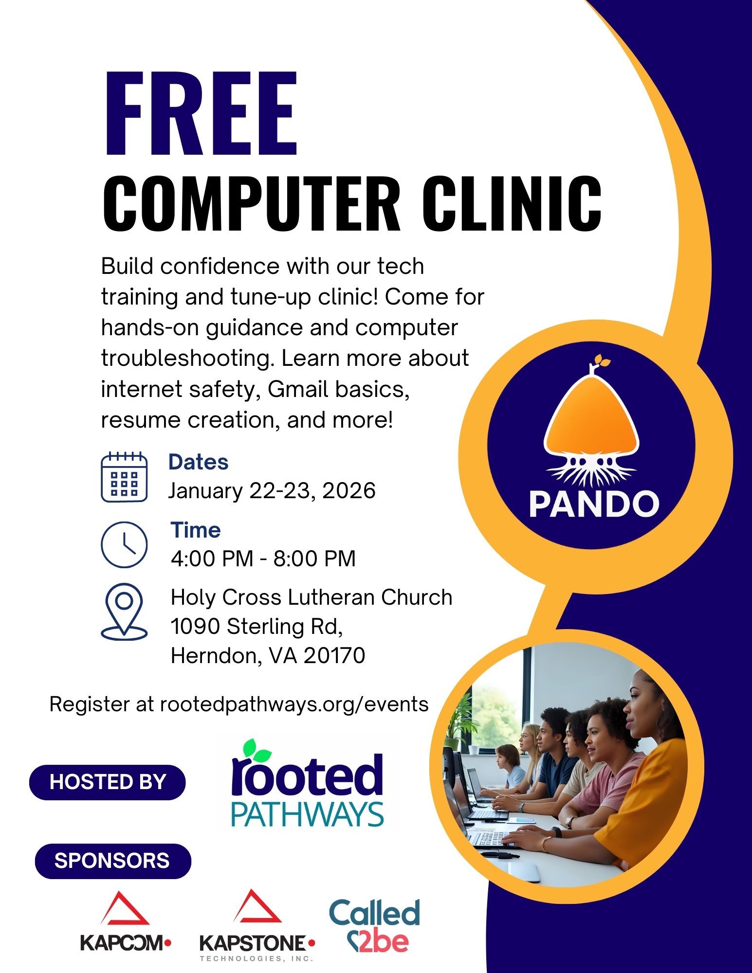 The Pro-Active Navigation of Digital Objectives Program, or PANDO Program, is a series of four quarterly events where Rooted Pathways hosts educational events and charitable services, with curriculum covering various computer topics and providing services to consult and/or fix hardware for attendees.